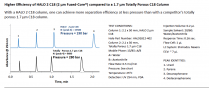 Their ability to generate hyper-fast separations comes not only from their small particle size (2.7 µm) but also from the unique Fused-Core® particle technology that creates a 0.5 µm porous shell fused to a solid core particle. As you increase mobile phase flow rate to speed-up a separation, the slow mass transfer of solute molecules inside the particles can limit resolving power. Fused-Core® particle technology addresses this limitation by providing an incredibly small path (0.5 µm) for diffusion of solutes into and out of the particles, thereby reducing the time solute molecules spend inside the particles and minimizing a major barrier to fast chromatographic separations.