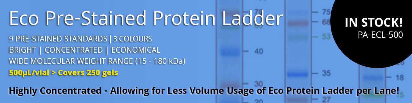 The Eco Pre-Stained Protein Ladder is a three-color (green, red, and blue) protein standard with nine pre-stained proteins including a wide range of molecular weights between 15 and 180 kDa.