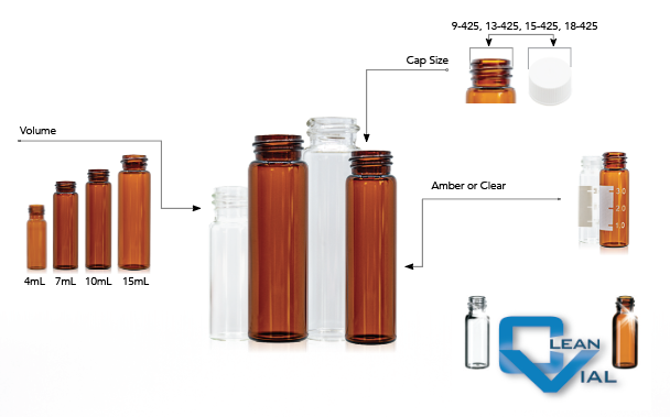 Storage vials are available in 1, 2, 3 and 4 dram (4mL, 7mL, 12mL, 15mL), clear or amber. Screw top caps can be ordered separately or as a part of our storage convenience kits.